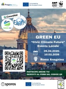 Continua il nostro impegno per il progetto: “GREEN EU – Building European Resilience to Climate Change Impacts” N. 101148104 cofinanziato dalla Commissione europea – Programma CERV (Citizenship, Equality, Rights and Values) A Roma, il 9 e il 10 febbraio Evento Locale Civic Climate Future.